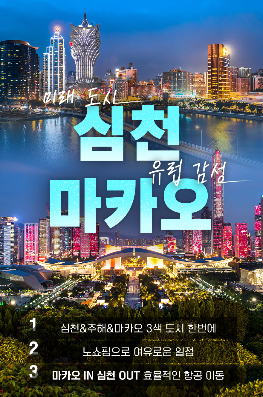 (※ 이 여행상품의 숙박시설은 현재 미정입니다. 출발 2일전까지 홈페이지를 통해 알려드리겠습니다.) ■ 여행 핵심 POINT - 전일정 특급호텔 숙박 - 심천/주해/마카오 3색 도시를 한번에 느낄 수 있는 여행 - 광동식, 호남식, 포르투갈식, 한식, 운남식 또는 사천식 5대 특식 제공 ■ 주해 관광 일정 1. 주해의 명물이자 랜드마크 어녀상, 연인의 거리, 경산해변 2. 풍부한 역사문화와 독특한 건축양식을 볼수있는 북산대원 ■ 마카오 관광 일정 1. 기념품 가게, 식당, 디저트가게 등이 밀집해 있는 마카오 타이파빌리지 2. 포토스팟 가득한 콜로안빌리지(에그타르트 1인1개 제공) 3. 마카오의 맛 육포&쿠키거리 ■ 심천 관광 일정 1. 심천과 홍콩의 경계 심천만 공원 2. 쇼핑과 함께 길거리 음식을 즐길수있는 동문 보행거리