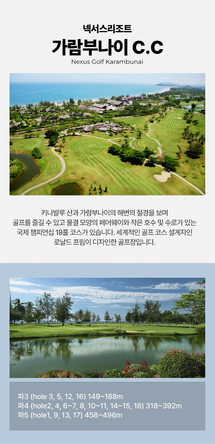 ■ 호텔 - 넥서스리조트 오션파노라마 디럭스룸 → 오션 파노라마 프리미어룸 무료 업그레이드 ■POINT1. 가람부나이 C.C 18홀 라운딩 * 3일 / 54홀 라운딩 그린피, 카트비, VAT 포함 ■POINT2. 취향따라 부담없이 즐기는 나만의 코타키나발루 여행 오전or오후 자유일정으로 편안한 골프 & 휴양 ■POINT3. 코타키나발루 시내 KK라운지 이용권 증정