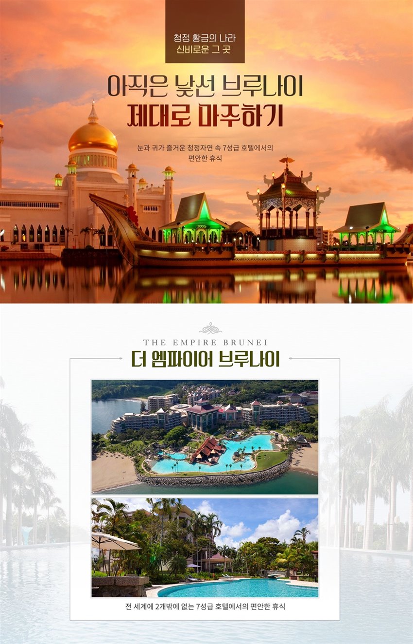 전 일정 7성급 엠파이어호텔 투숙 브루나이 3색 골프 54H 포함 $40불 상당 나이트투어 포함 부담없는 노쇼핑,노팁,노옵션 일정 무알콜 샴페인 룸당 1병 제공