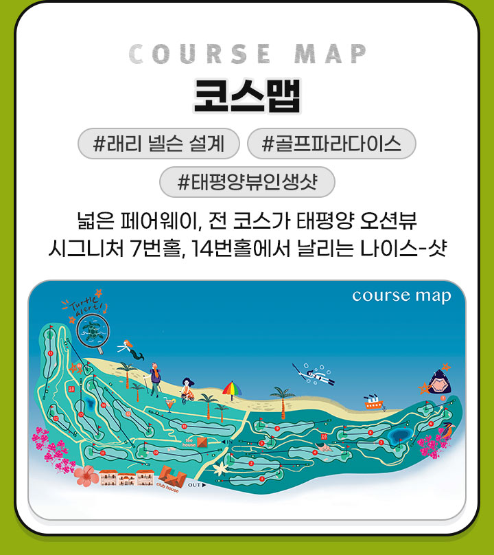 POINT1. 사이판 대표 골프리조트 코럴오션리조트 2022년 1월 오픈, 리조트 전체 리뉴얼 매일 18홀*3 총 54홀 라운딩 매일 2회 리조트식 제공(조식+석식) * 투숙 인원에 따라서 단품 메뉴 제공 OR 뷔페식으로 진행 POINT2. 사이판 유일의 LPGA 규격 골프장 COR C.C 자연과 바다가 어우러진 환상적인 코스에서 즐기는 라운딩 2인 Play 가능(*현지 사정에 따라 조인될 수 있음) POINT3.. 오전출발, 오후도착의 꽉찬 일정 ■ 항공 - 제주항공 - 무료 위탁수하물 1인당 1개 23KG, 기내 반입 1인당 1개 10KG - 골프백 추가 편도당 5만원 ■ 호텔 코랄오션리조트 - 전화 : +1 670-234-7000 - 위치 : 사이판 공항에서 차량으로 5분 거리 - 객실 : 디럭스 오션뷰 ▶ 객실 타입 변경 원할 시 담당자 문의